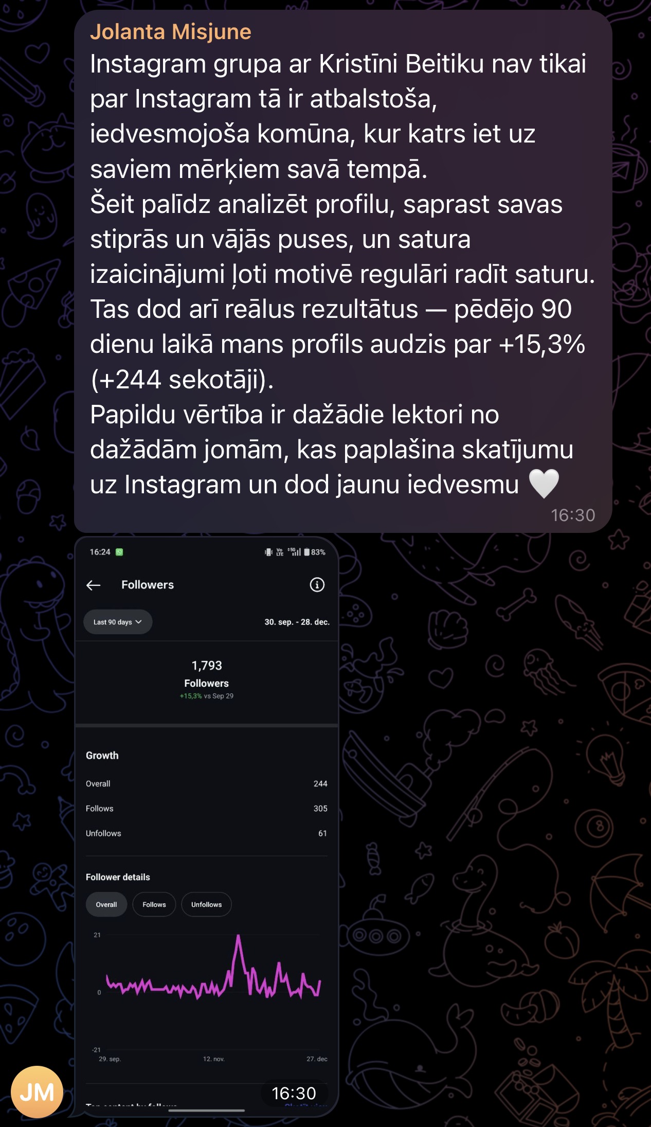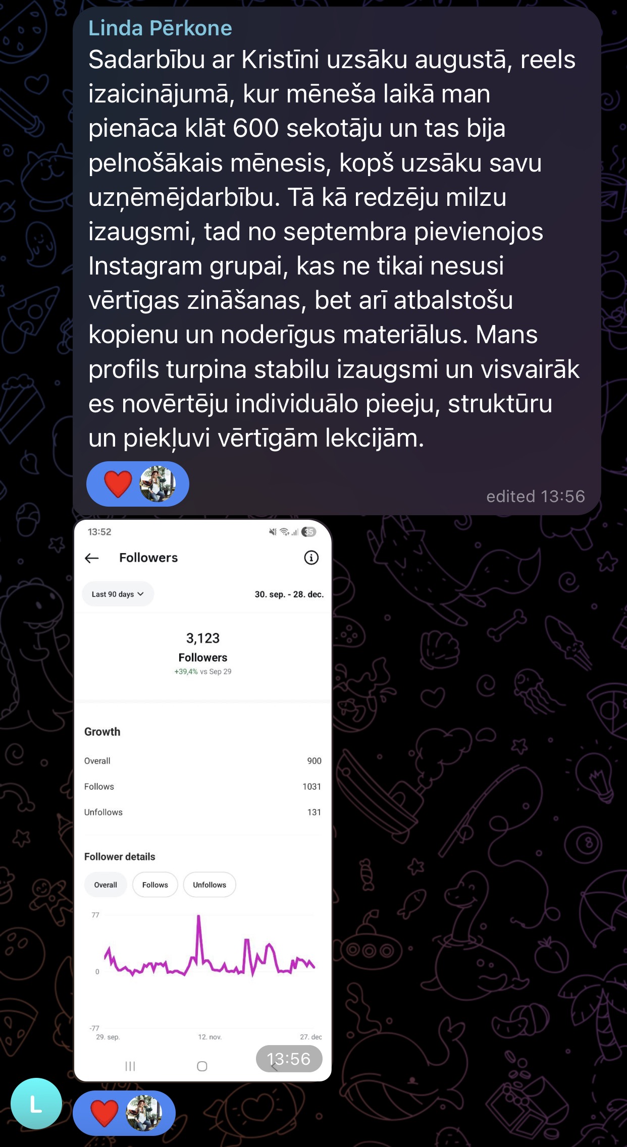 Profesionālajā dzīvē esmu mārketingā. Ar degsmi palīdzu citiem izveidot saturu, attīstīt savu Instagram un izmantot sociālos medijus tā, lai tie strādā — nevis rada stresu vai nepārliecību. Esmu redzējusi visu: minēšanu, perfeksionismu, stagnāciju, algoritma lēkāšanu un arī to brīdi, kad beidzot parādās rezultāti.